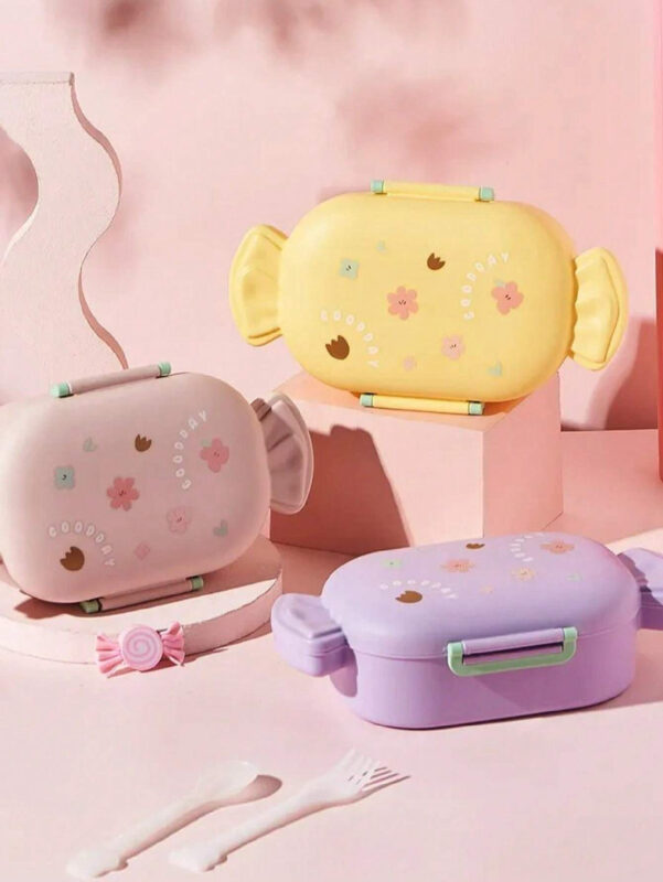 Fiambrera con diseño con forma de caramelo, caja de bento portátil estilo Kawaii con compartimentos, tapa hermética e incluye utensilios,