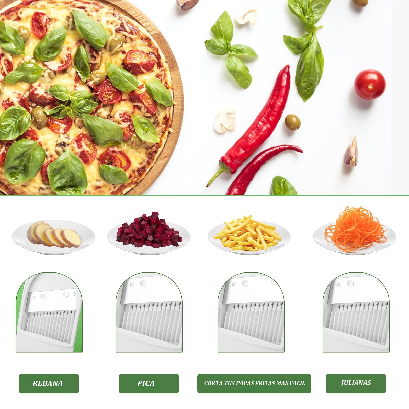 Con este cortador, las tareas más tediosas de la cocina se convierten en un trabajo rápido y eficiente. Ideal para quienes buscan preparar alimentos frescos y saludables en menos tiempo, ya sea para ensaladas, guarniciones, comidas principales o snacks.