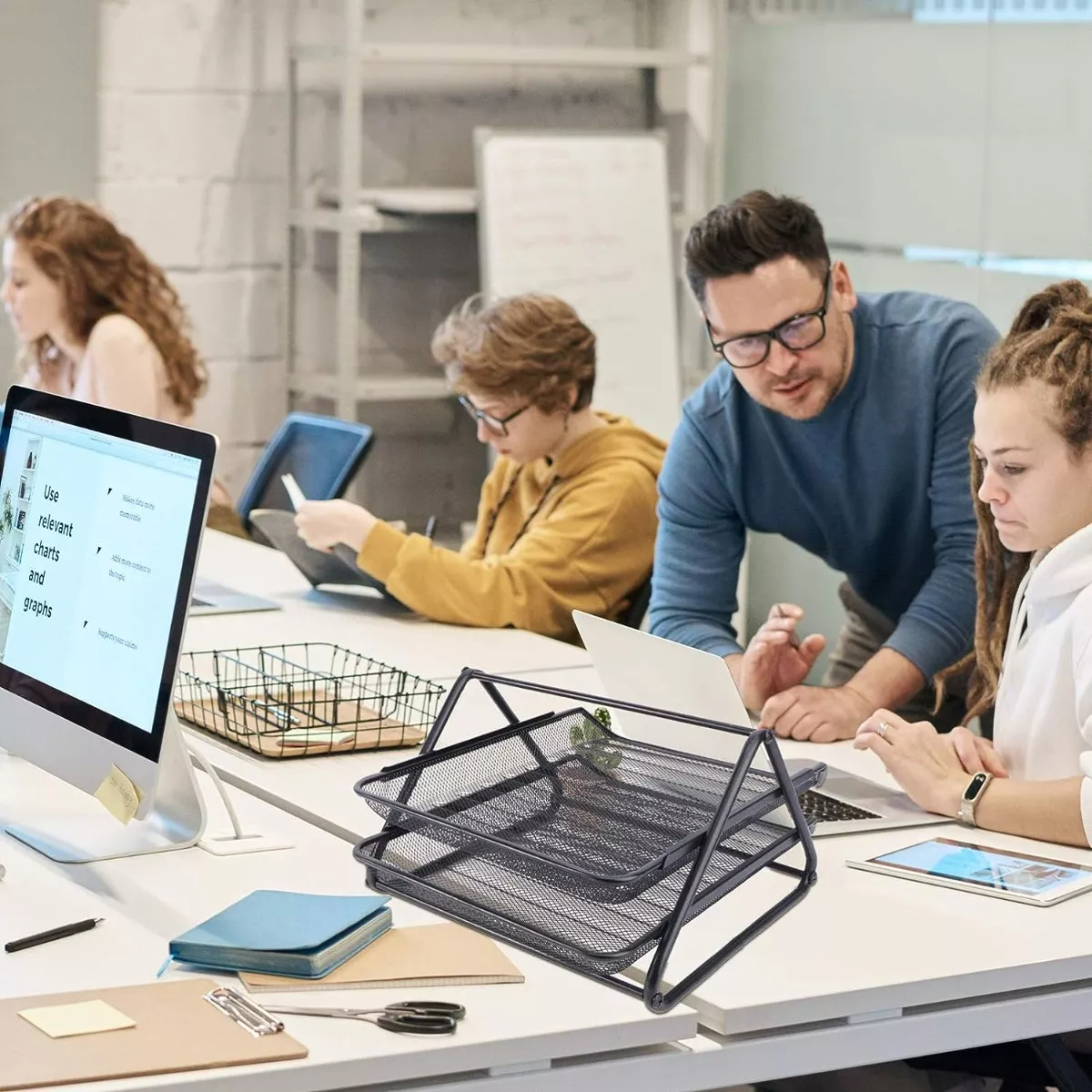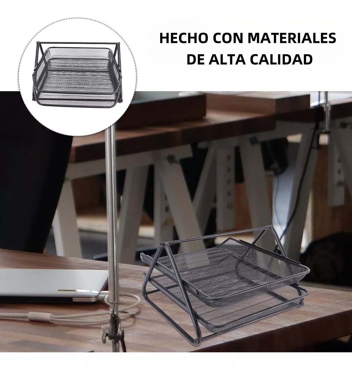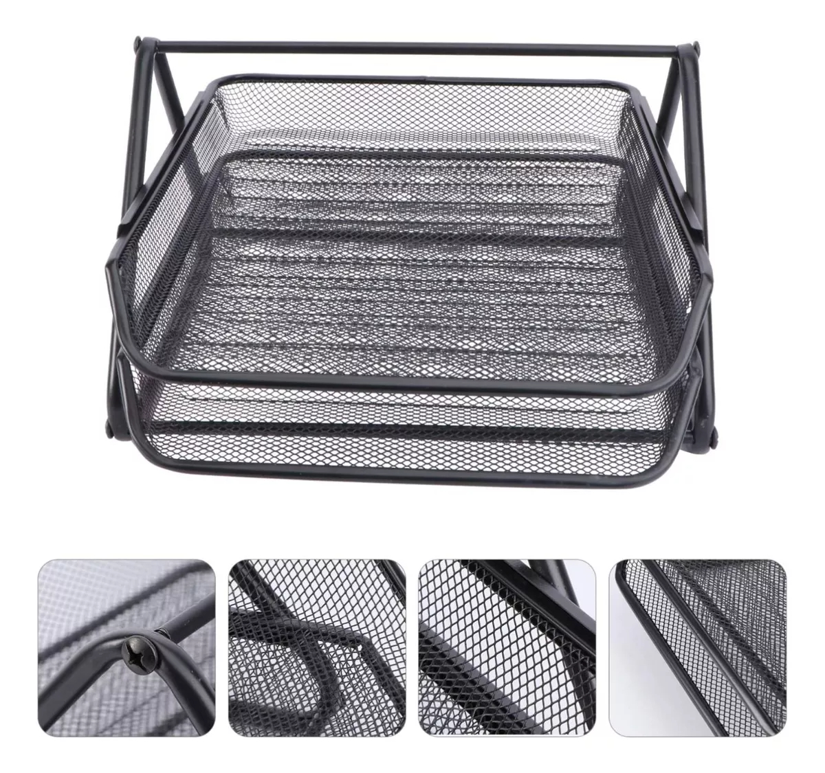 Este **organizador de escritorio de malla metálica** es la solución perfecta para mantener tu espacio de trabajo limpio, ordenado y eficiente. Su diseño moderno y funcional de **dos niveles** permite organizar documentos, carpetas, revistas y otros materiales esenciales, optimizando al máximo el uso del espacio en oficinas, escritorios de estudio y ambientes profesionales. Fabricado con **materiales de alta calidad**, este organizador no solo es práctico y resistente, sino también estéticamente atractivo, integrándose sin esfuerzo a cualquier decoración.
