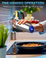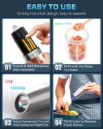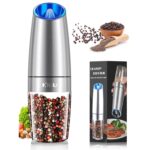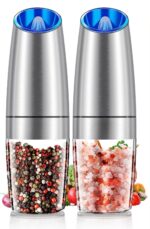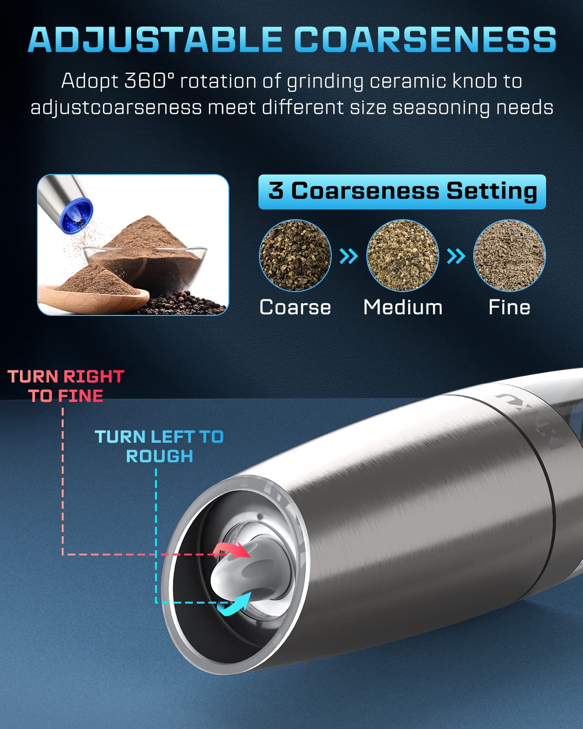 Juego de 2 molinillos automáticos de sal y pimienta con tecnología de gravedad, diseño moderno de acero inoxidable, grado de molienda ajustable, operación con una sola mano, luz LED incorporada, excelente para cocinar y sazonar, apto para sal rosada del Himalaya, pimienta negra, especias, herramienta de cocina de calidad para uso doméstico y profesional