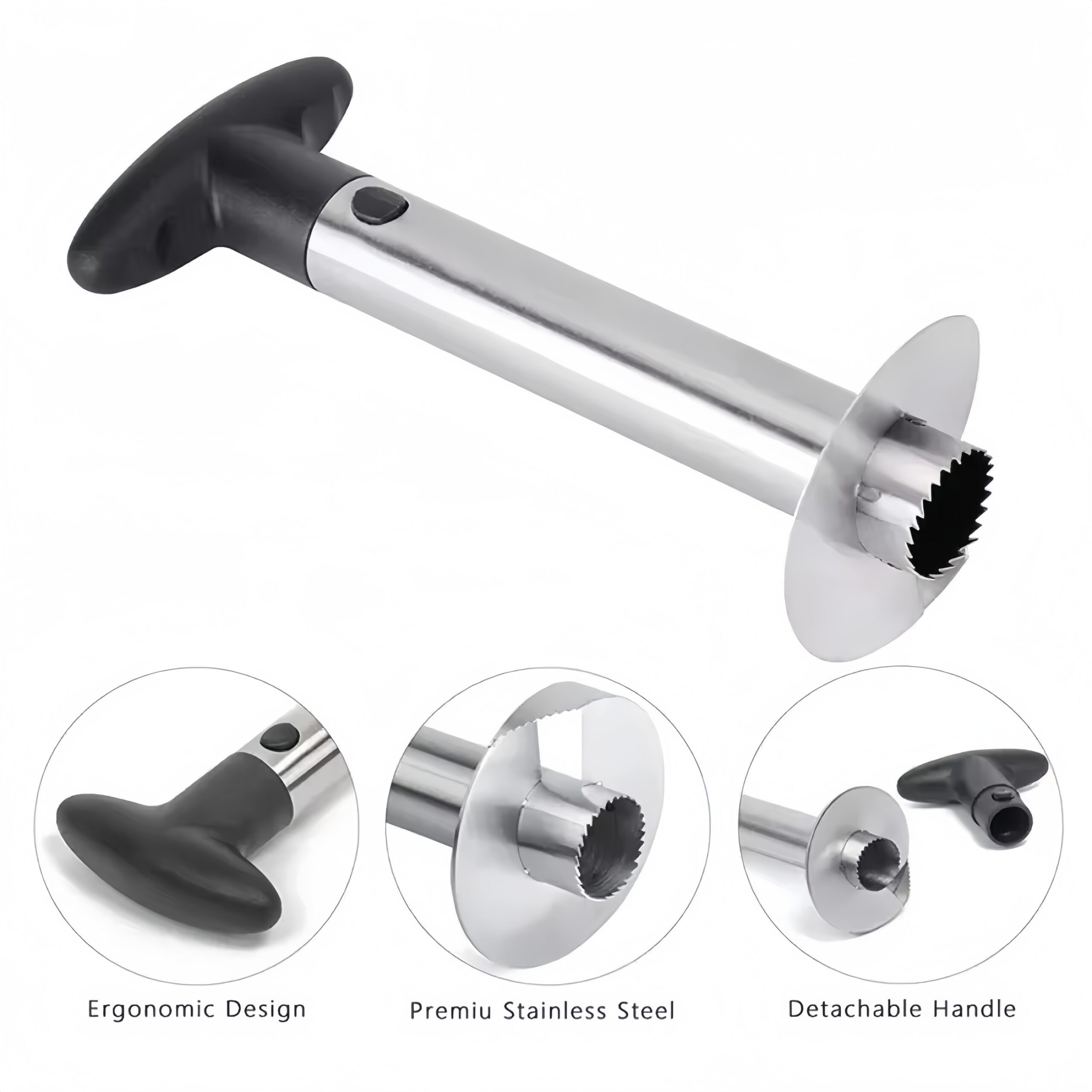 Simplemente corta la parte superior de la piña, inserta el cortador y gira el mango con una ligera presión. En pocos segundos, obtendrás rodajas perfectamente formadas, listas para servir o usar en tus recetas favoritas.